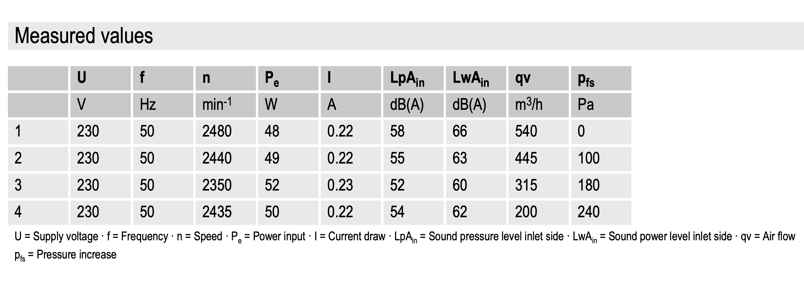 - Approximately 540 m³/h air flow and 48 W power usage.