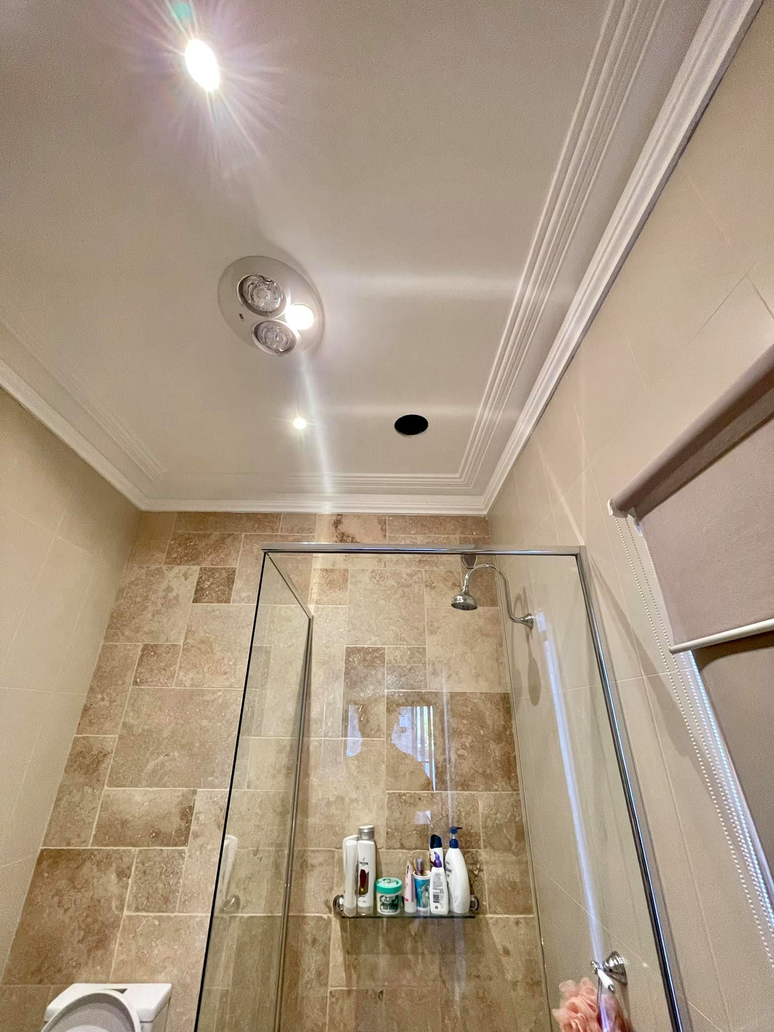 This is installed in your bathroom ceiling (ideally directly above the shower) and connected to the fan via ducting. Once installed it is discreet and sits almost flush with your ceiling.